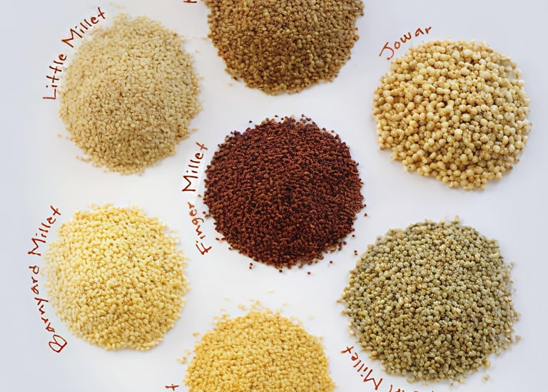 Types: Finger Millet (Ragi), Foxtail Millet, Little Millet, Sorghum (Jowar), Pearl Millet (Bajra)
